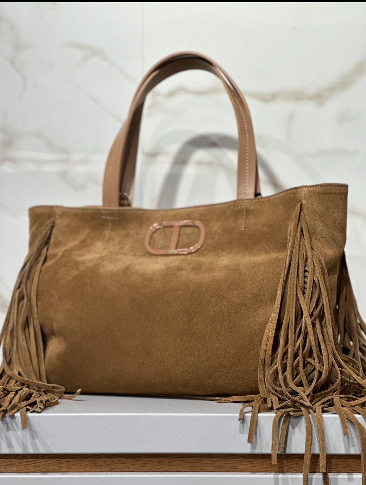 První kabelka na sebe strhne pozornost na první pohled. Vyrobena z měkké semišové kůže v karamelovém odstínu, doplněná o výrazné třásně po stranách, působí hravě, ale stále elegantně. Ideální pro ženy, které se nebojí originality a chtějí dodat outfitu špetku boho stylu.