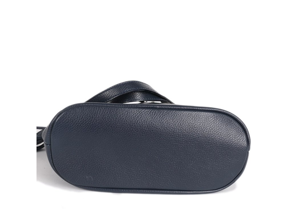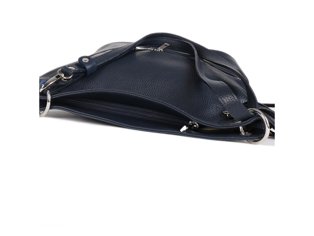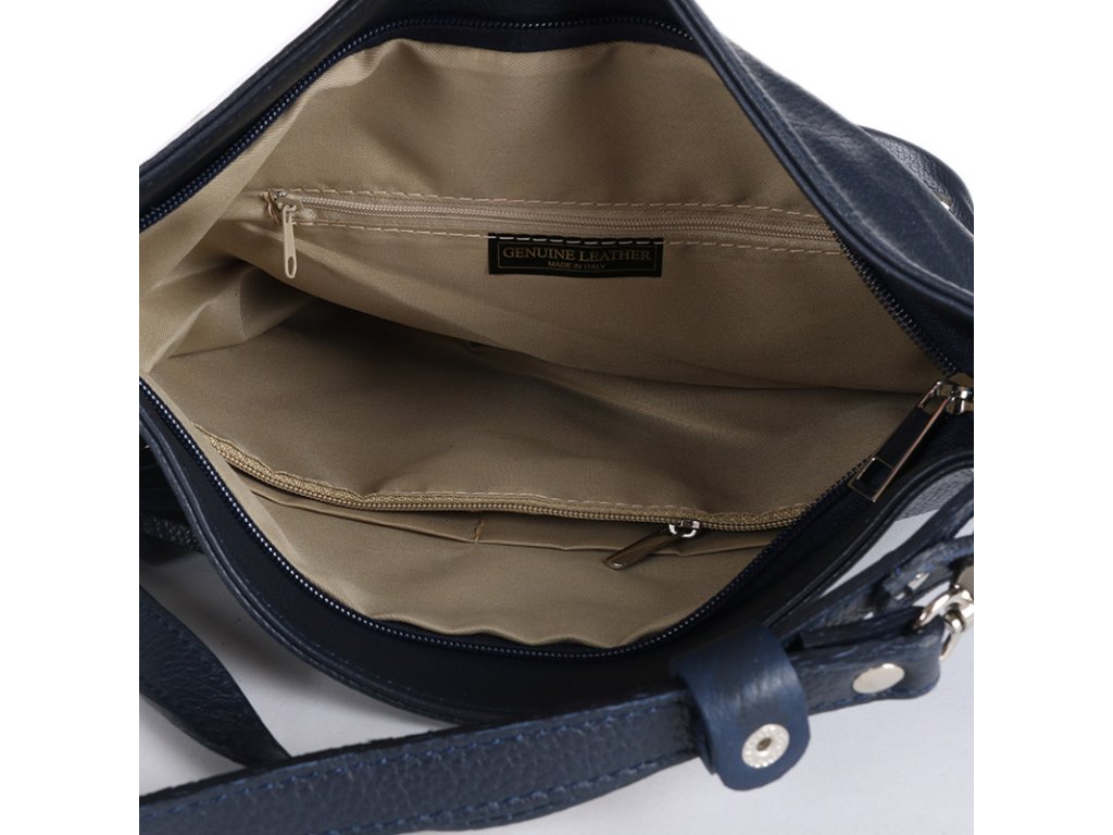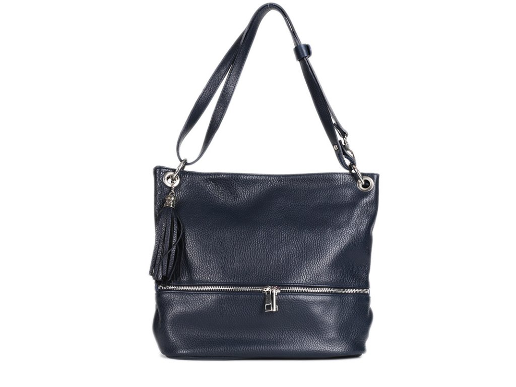 Vnitřek tvoří dvě komory, které jsou oddělené kapsou na zip. Dále jsou uvnitř dva otevřené kapsy a jedna kapsa na zip. Na zadní vnější straně je kapsa na zip (11 cm x 17 cm). Kabelka je celá šitá z pravé kůže v Itálii. Má krásný vroubkovaný tvar, který jasně ukazuje kvalitu pravé kůže. Výborně se nosí crossbody i přes rameno. Kabelka je ozdobena koženým střapcem, který je stále trendy, a má přední kapsu na zip (8,5 cm x 29 cm), kam můžete bezpečně uložit své cennosti. Kování je stříbrné. Barva kabelky je tmavá modrá. Vnitřek je podšitý látkou.