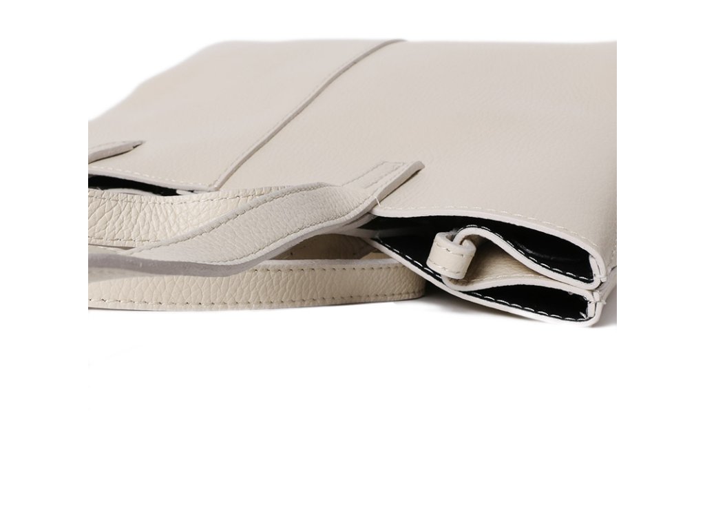 Dvě kratší pevně uchycená ucha umožňují pohodlné nošení v ruce, zatímco delší ramenní popruh zajišťuje volnost pohybu při nošení přes rameno. Zapínání na magnetické patentky je rychlé a praktické, zároveň zachovává čistý a minimalistický vzhled.