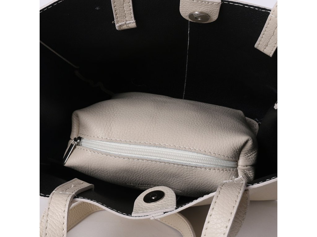 Uvnitř se nachází menší černá kosmetická taštička na zip – ideální pro uložení klíčů, telefonu nebo jiných drobností. Díky neutrální béžové barvě kabelku snadno sladíte s formálním i volnočasovým outfitem. Je ideálním společníkem do práce, na schůzku i na běžné pochůzky po městě.