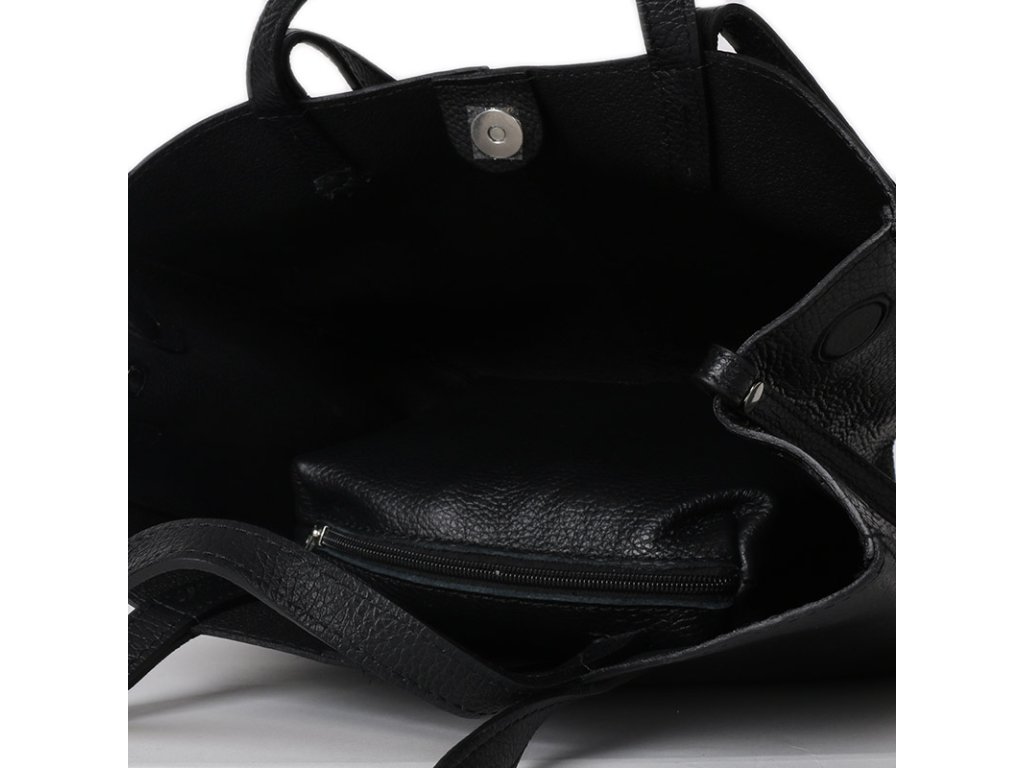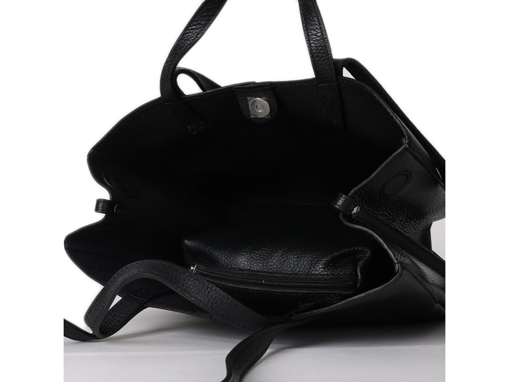 Tato elegantní kabelka z kvalitní černé kůže s jemnou texturou je skvělým doplňkem pro každodenní nošení i formálnější příležitosti. Má středně velký shopper tvar s pevnou konstrukcí, pevným dnem a lehce rozšířeným horním okrajem, který dodává kabelce moderní siluetu.
