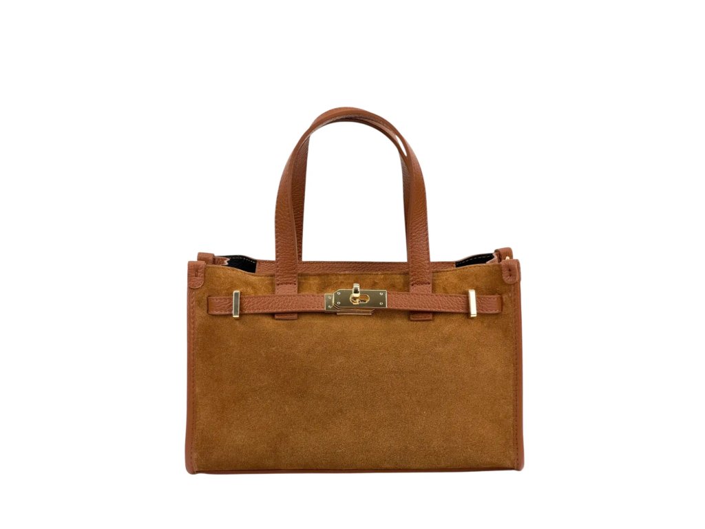 Tato kabelka je vyrobena z pravé semišové kůže v odstínu camel. Má střední velikost a pevný, elegantní tvar. Součástí je dlouhý popruh o délce 110 cm, takže ji lze pohodlně nosit i jako crossbody. Zapíná se na zip a uvnitř má také otevřenou kapsu pro snadnou organizaci věcí. Kombinace semiše, hladké kůže a zlatých kovových detailů působí luxusně a nadčasově.