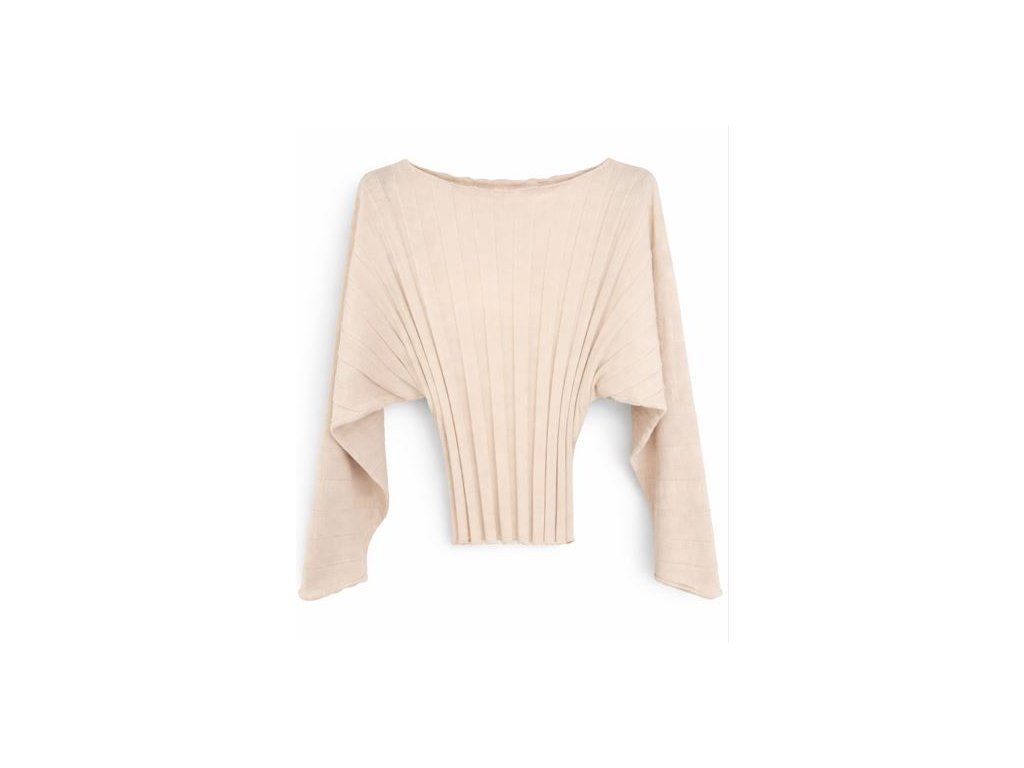 Elegantní béžový top z jemného úpletu zaujme svým minimalistickým, ale zároveň sofistikovaným designem. Má volnější střih s netopýřími rukávy, které se směrem k zápěstí zužují, čímž vytvářejí zajímavou siluetu. Vertikální žebrování opticky prodlužuje postavu a dodává materiálu strukturu.
