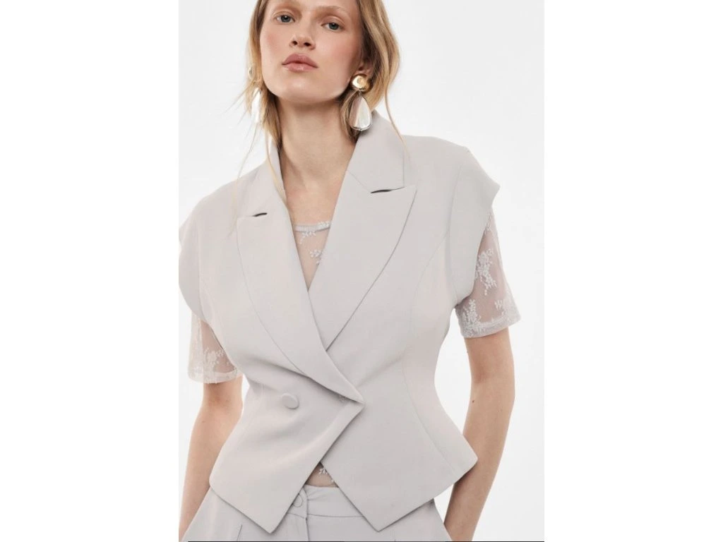 Elegantní dámská vesta v jemném neutrálním odstínu představuje moderní a sofistikovaný kousek, který snadno pozvedne každý outfit. Má krátký, lehce strukturovaný střih s výraznými klopami, které dodávají vestě nadčasový a minimalistický vzhled.