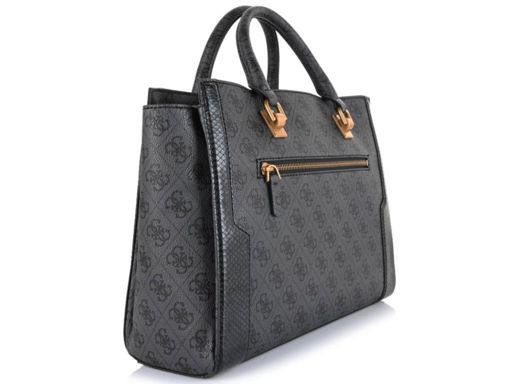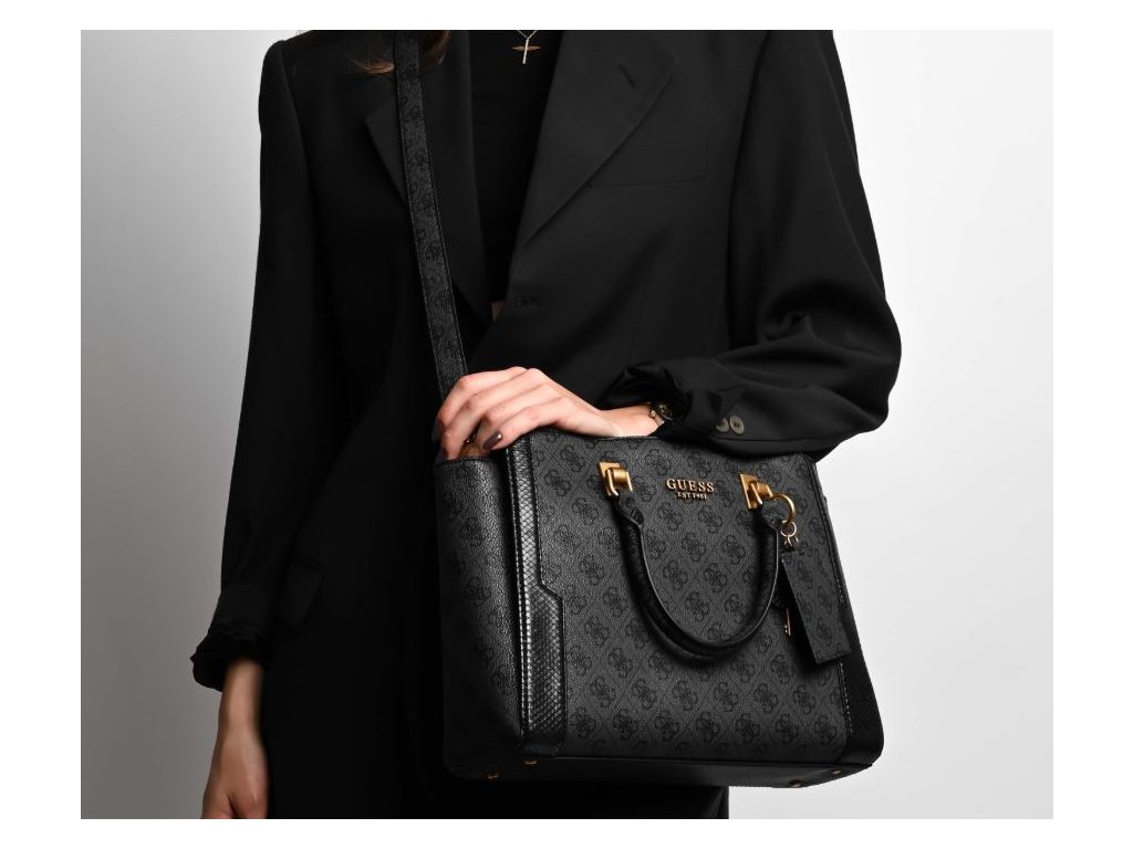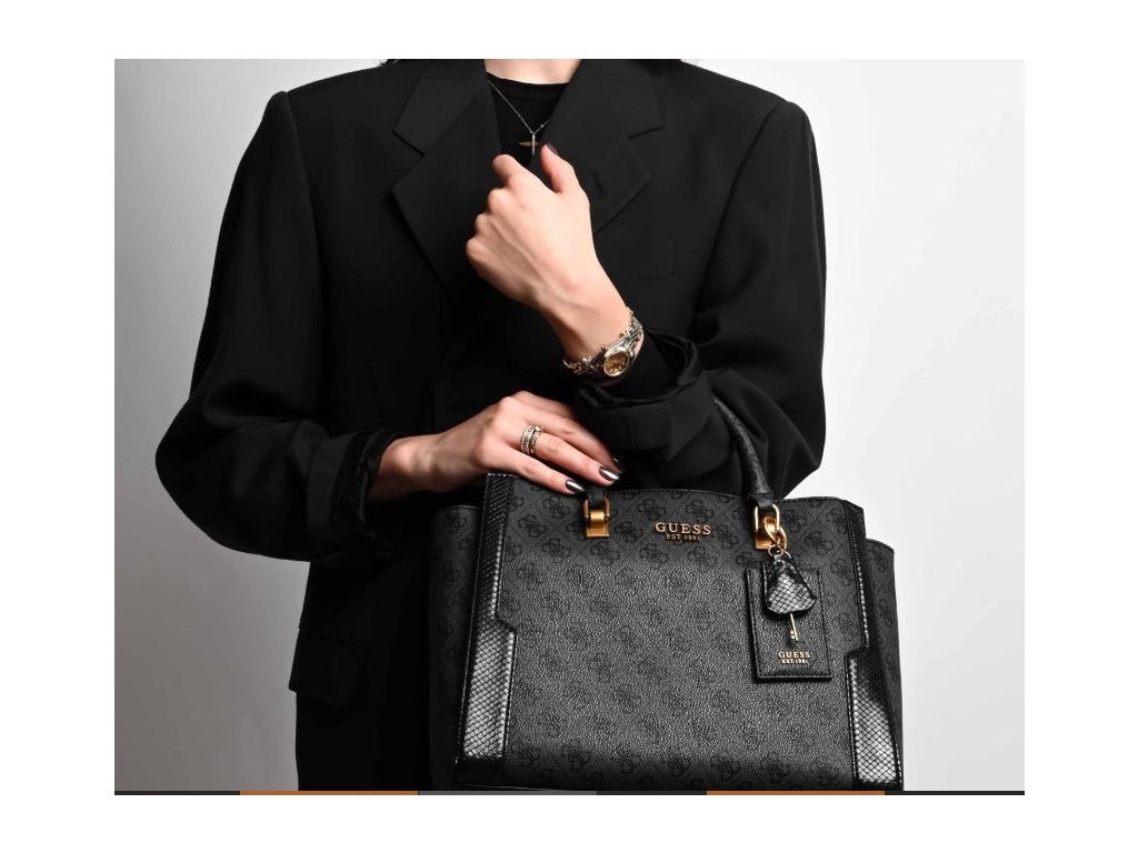 Dámská stylová kabelka značky Guess v šedé barvě, zdobená logem značky po celé ploše. Kabelka má tři komory se samostatným zapínáním na magnet. Uvnitř se nacházejí dvě otevřené kapsy a jedna kapsa na zip. Bez problémů se do ní vejde i formát A4.