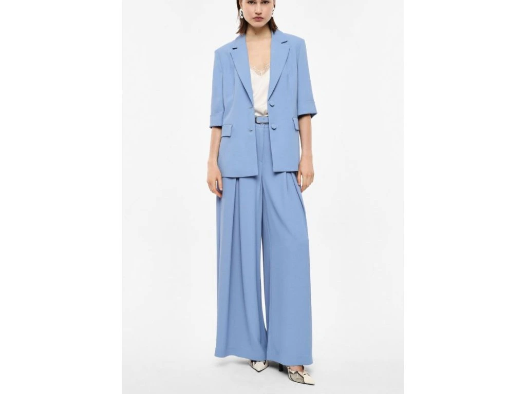 Elegantní dámské kalhoty v jemném modrém odstínu spojují styl s maximálním pohodlím. Vysoký pas s páskem krásně zvýrazní postavu a dodá outfitu upravený, sofistikovaný vzhled. Široké nohavice s jemným řasením působí lehce a vzdušně, takže se hodí jak na běžné nošení, tak i na formálnější příležitosti.