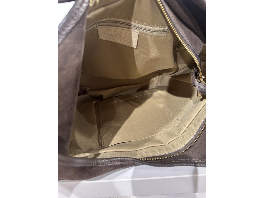 Stylová italská kožená semišová kabelka z prvotřídní měkké kůže představuje jeden z nejnovějších módních trendů. Je navržena tak, aby byla maximálně praktická, ale zároveň elegantní. Kabelka se zapíná na zip a její vnitřní uspořádání tvoří jedna prostorná komora, zipová kapsa na cennosti a otevřená kapsička na drobnosti. Díky své velikosti bez problémů pojme formát A4, takže je ideální i do práce či školy.