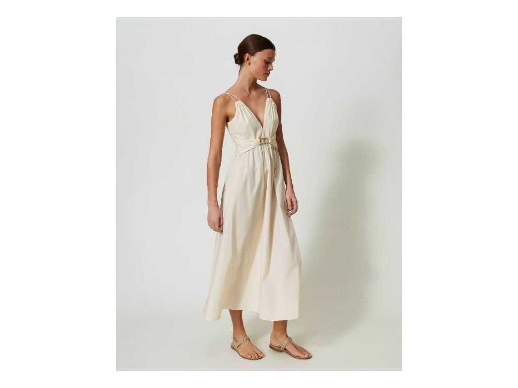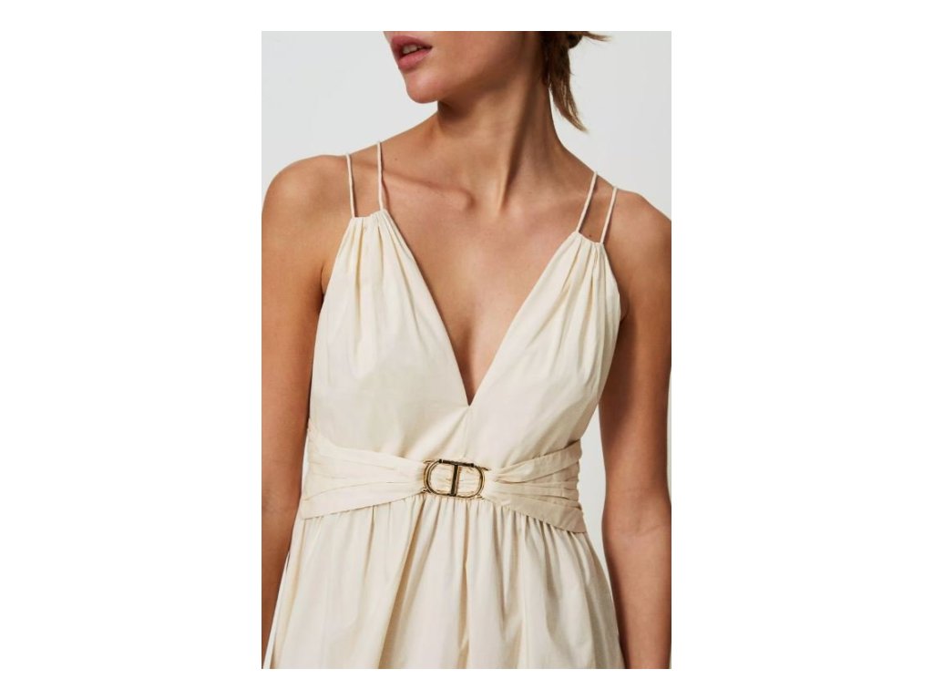 Šaty mají nabraný kovový pásek, který drží oválná přezka s logem značky Twinset. Charakteristické jsou dvojité ramínka, decentní výstřih do tvaru V a zapínání na zip na boční straně.
