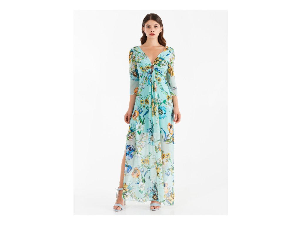 Krásné letní šaty v příjemném modrém odstínu s jemným květinovým motivem a výstřihem do V. Ve výstřihu je ozdobný kruhový detail obšitý látkou z ramínka. Šaty mají volný, splývavý střih a na boku elegantní rozparek. Na zádech se nachází výstřih ve tvaru V, který modelu dodává originální a neobvyklý charakter. Materiál je velmi lehký a příjemný na nošení. Pas je pevně řešený a rukávy jsou delší, volné a vzdušné.