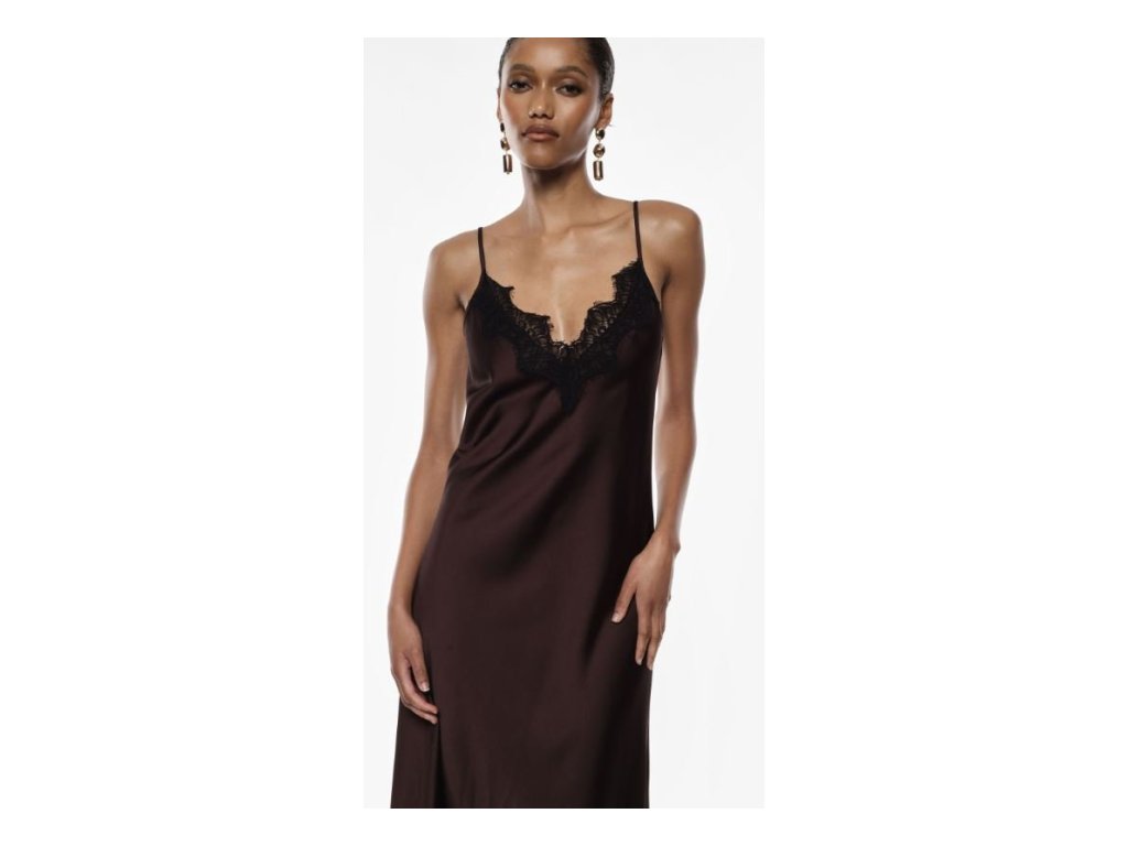 Elegantní maxi šaty ušité z jemného saténu s lehce lesklým povrchem a splývavou siluetou. Model zdobí tenká nastavitelná ramínka a hlubší výstřih do „V“, lemovaný jemnou krajkou, která dodává šatům ženskost a smyslný nádech. Rovný spodní lem a minimalistický střih vytvářejí nadčasový a sofistikovaný vzhled.