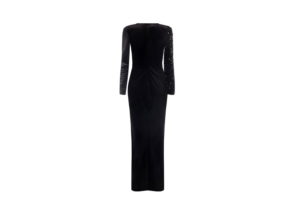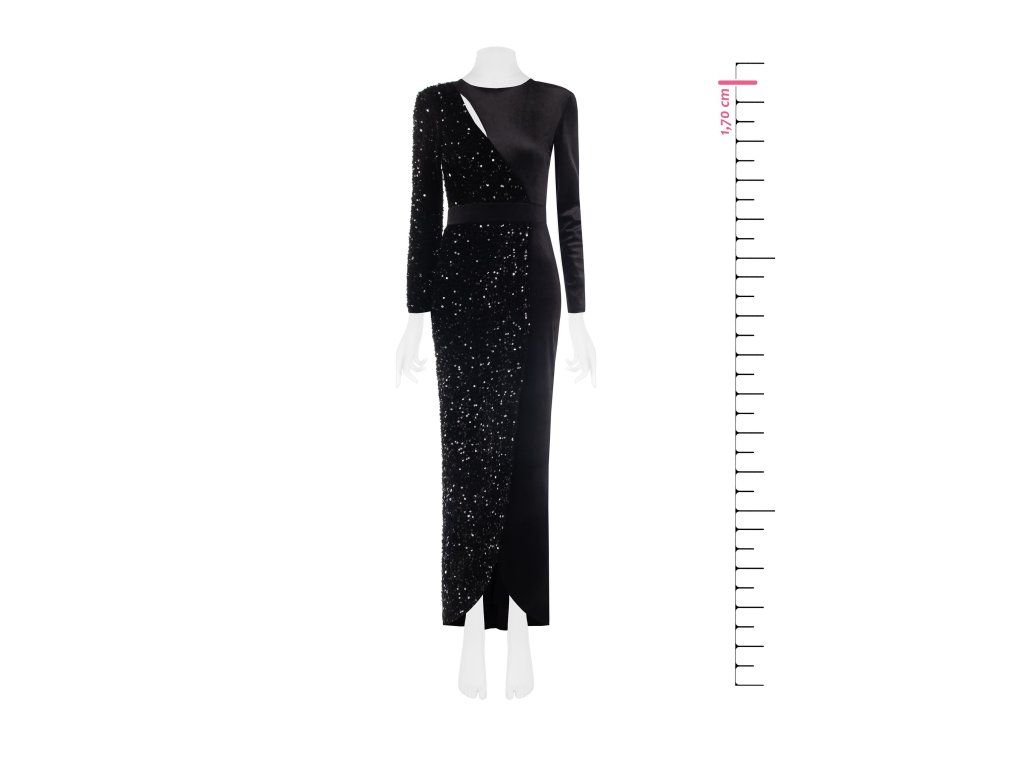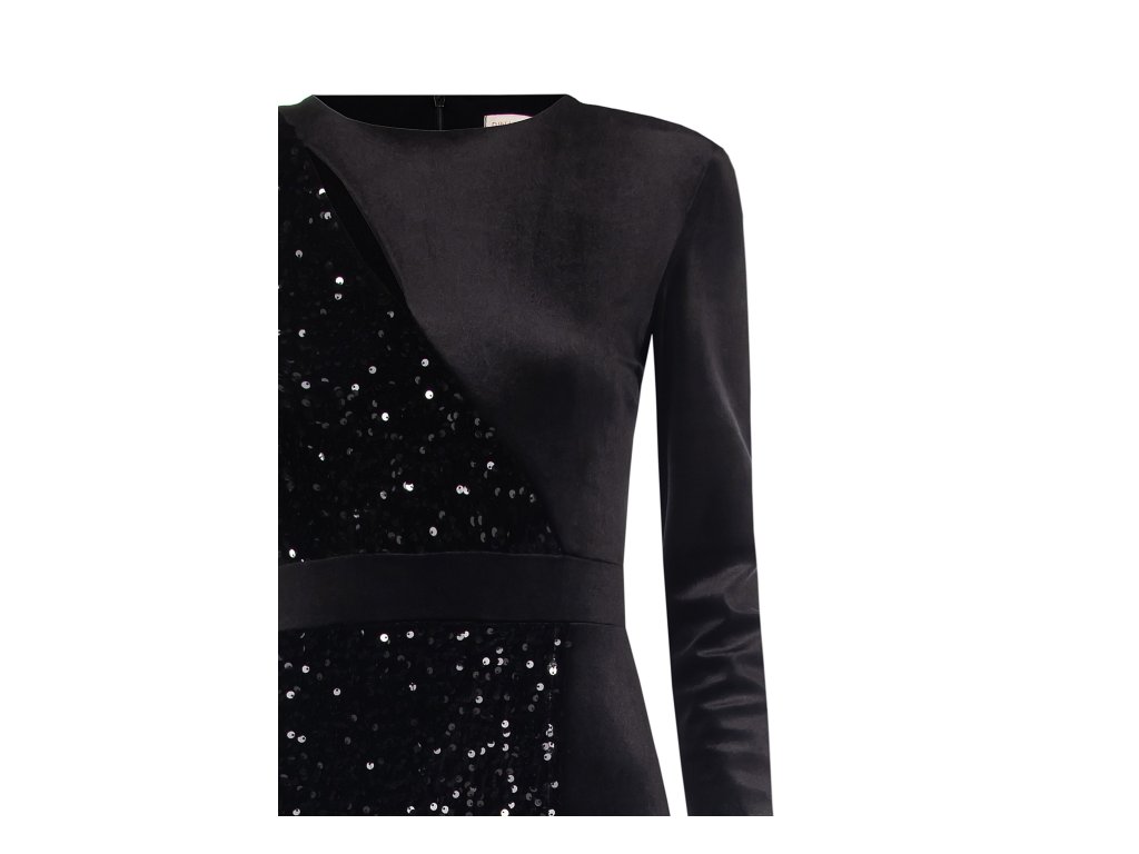 Tyto elegantní černé šaty zaujmou originálním asymetrickým designem, který kombinuje dva různé materiály. Jedna část je zdobena flitry a dodává modelu výrazný lesk a luxusní vzhled, zatímco druhá strana je z hladkého, matného materiálu, který vytváří moderní kontrast.