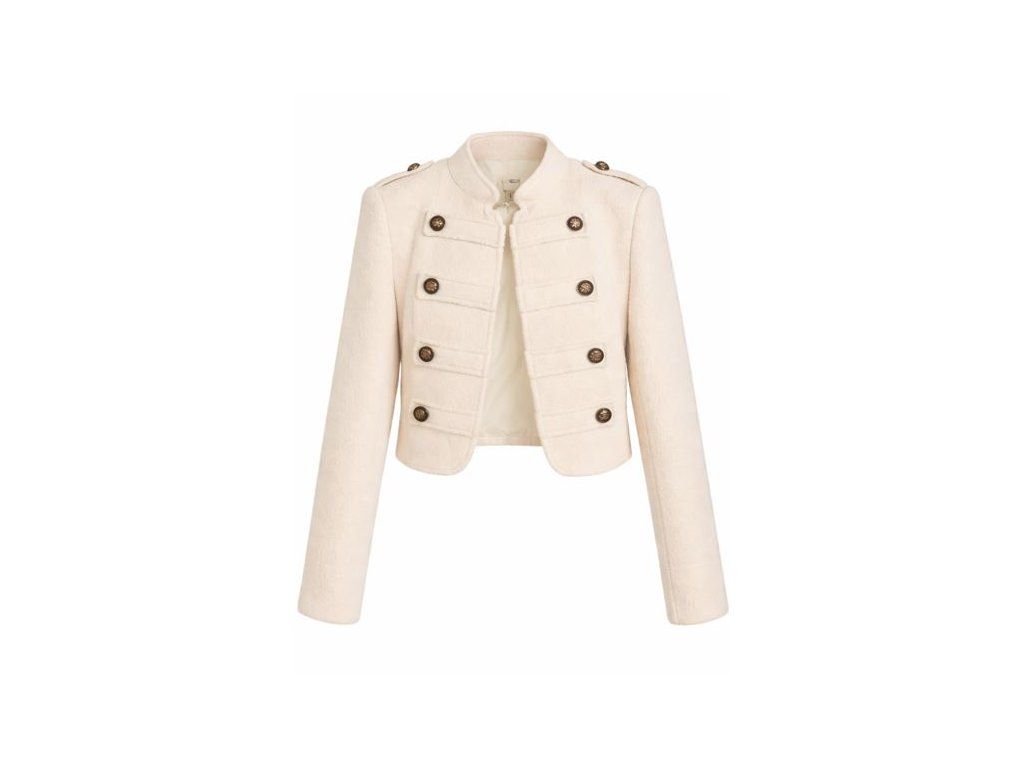 Dominantním prvkem jsou dekorativní knoflíky uspořádané v řadách na přední straně, inspirované vojenským stylem. Ty dodávají saku luxusní a zároveň trendový vzhled. Nechybí ani stojáček a ozdobné nárameníky, které podtrhují jeho jedinečný design.