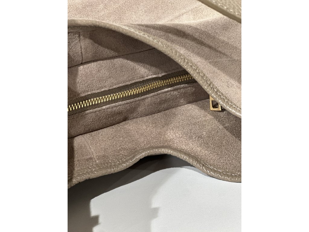 Stylová italská kožená semišová kabelka v taupe hnědé barvě je vyrobena z prvotřídní, měkké přírodní kůže a patří mezi nejnovější módní trendy této sezóny. Je elegantní, nadčasová a zároveň maximálně praktická pro každodenní používání. Kabelka má zapínání na zip a uvnitř se nachází jedna prostorná komora, zipová kapsa na drobnosti či cennosti a otevřená kapsička pro snadné uložení nezbytností. Díky své velikosti bez problémů pojme formát A4, takže je ideální do práce, školy i na běžné nošení.