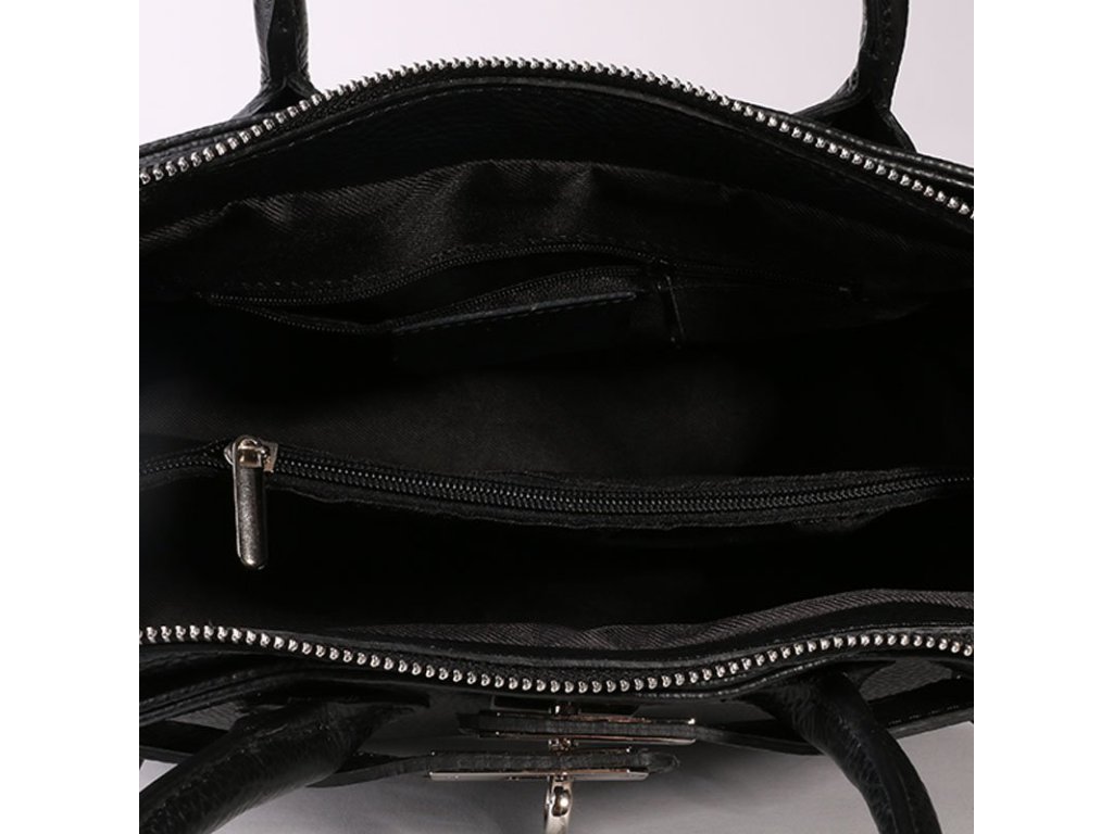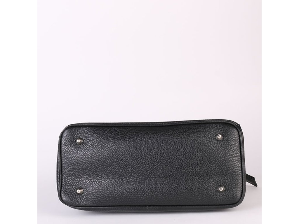 Zapínání je na zip, kování ve stříbrné barvě a kované cvočky na spodní straně chrání kabelku před poškozením.