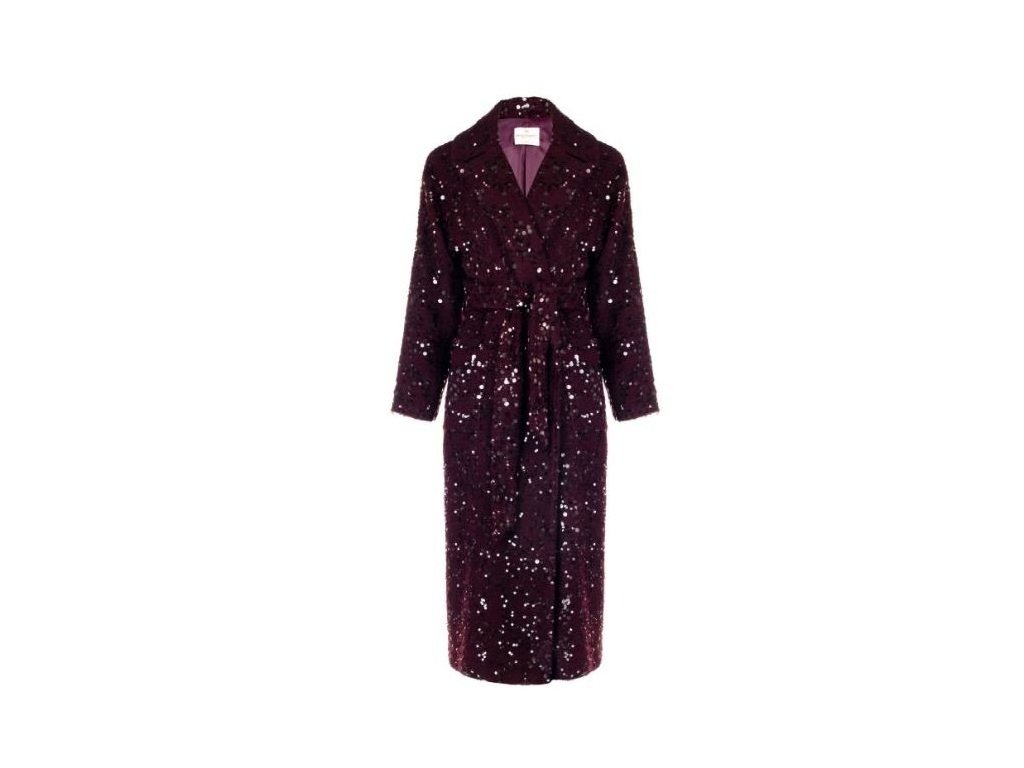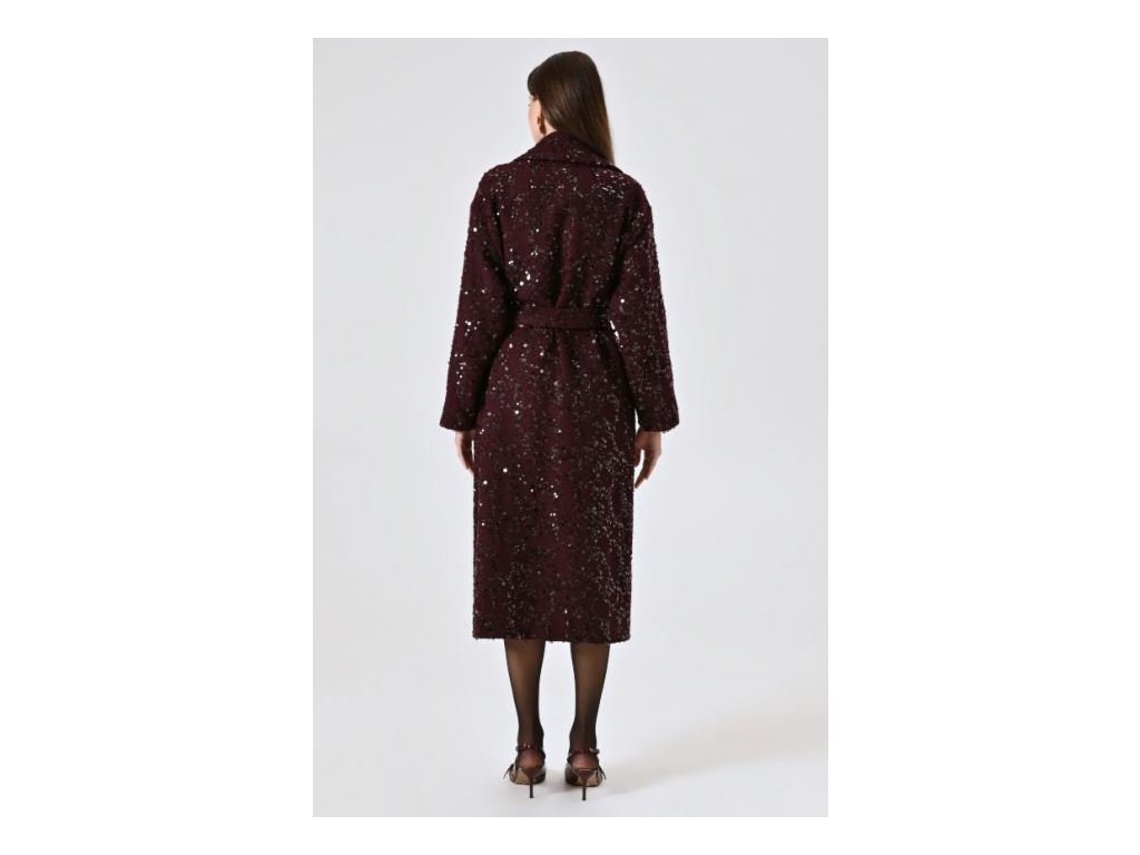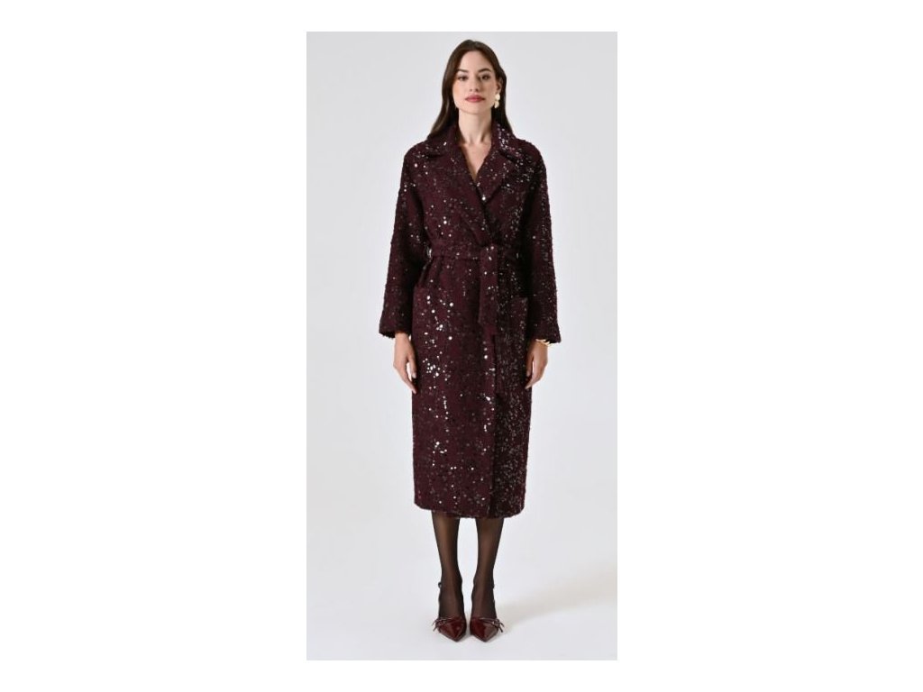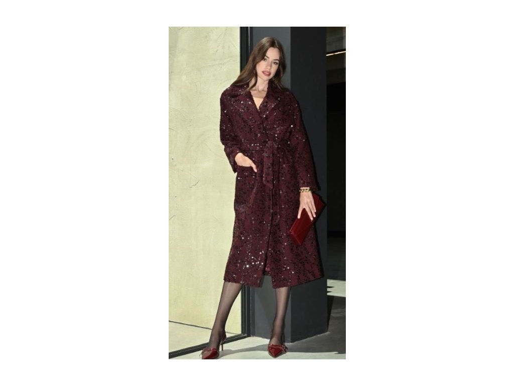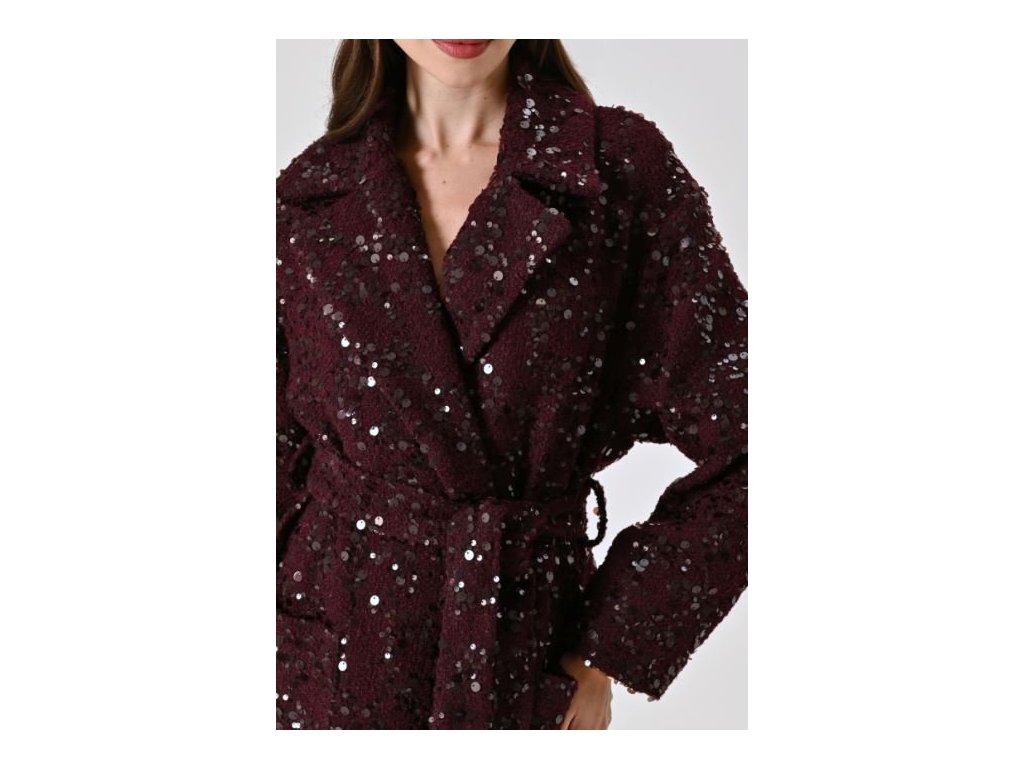 Kabát je vyroben z materiálu s příměsí vlny, která mu poskytuje příjemnou hřejivost a hebký dotek. Jeho bohatý vínovo-bordó odstín působí elegantně a žensky. Povrch kabátu je ozdoben jemnými lesklými flitry, které dodávají decentní, ale výrazný třpytivý efekt – ideální pro večerní příležitosti nebo jako stylový kousek do města.