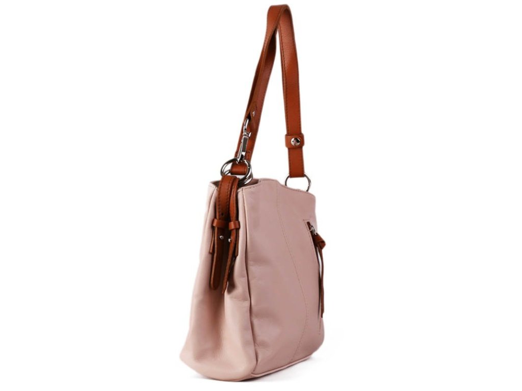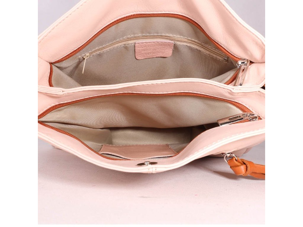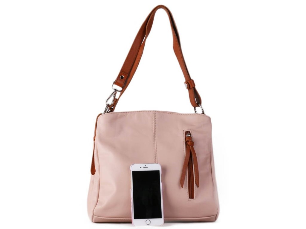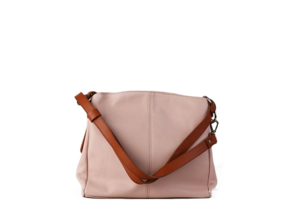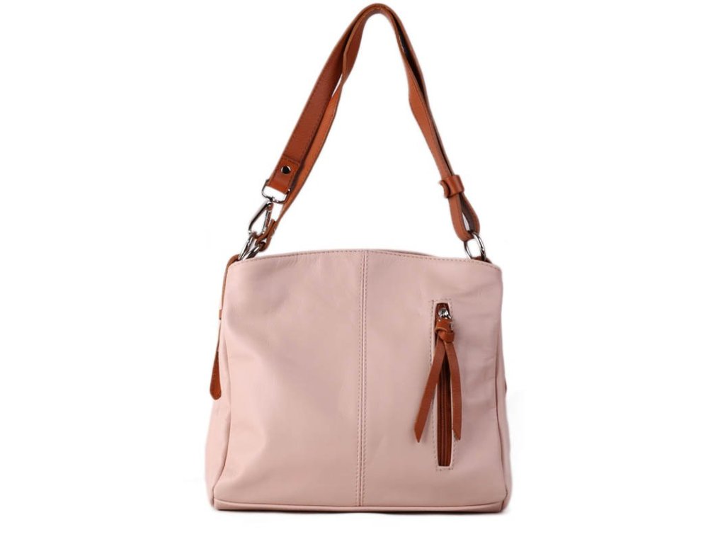 Dámy, představujeme vám elegantní koženou crossbody kabelku v jemné letní růžové barvě s kontrastními hnědými detaily.