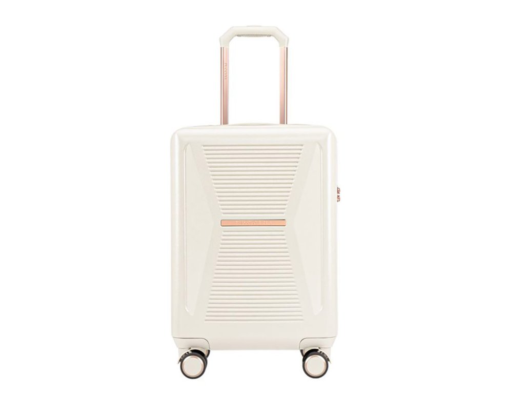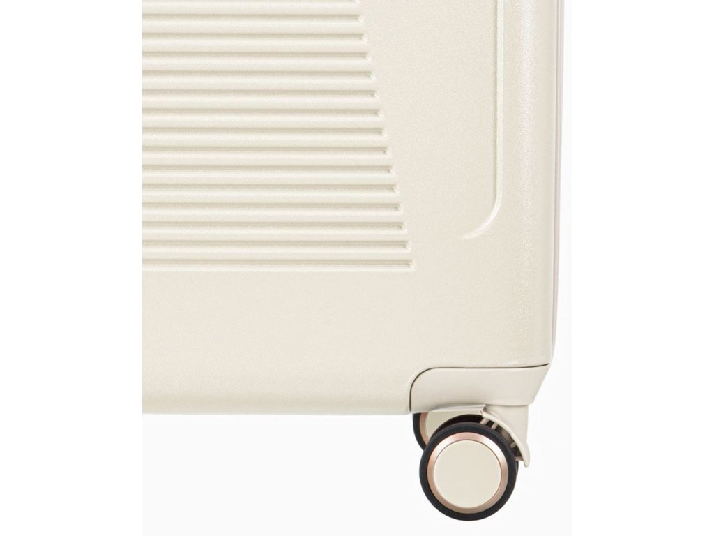 Kufr v bíle barvě o váze 2,7 kg určený i na palubu letadla. Značka je Puccini. Má zajímavý design hlavně díky žebrování do tvaru přesýpacích hodin. Při prvním kontaktu vás zaujme hlavně příjemná barva. Zajímavostí je také kování, které dodává kufru dávku luxusu a výjimečnosti. S tímto kufrem jistě budete nepřehlédnutelná.Je vyroben z nejkvalitnějšího polykarbonátu, který vám zaručí, že je více chráněn proti promáčknutí a poškrábání. Kufr se pohybuje pomocí 4 koleček, která se otáčejí o 360 stupňů. Všechny kované prvky jsou v barvě růžového zlata.