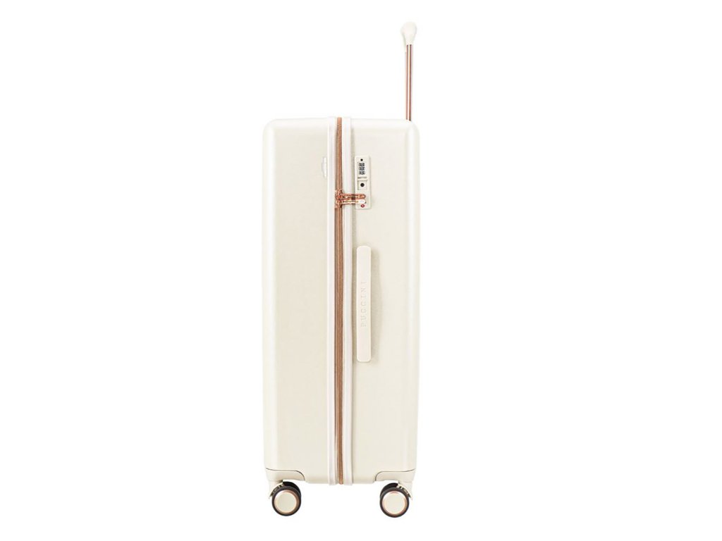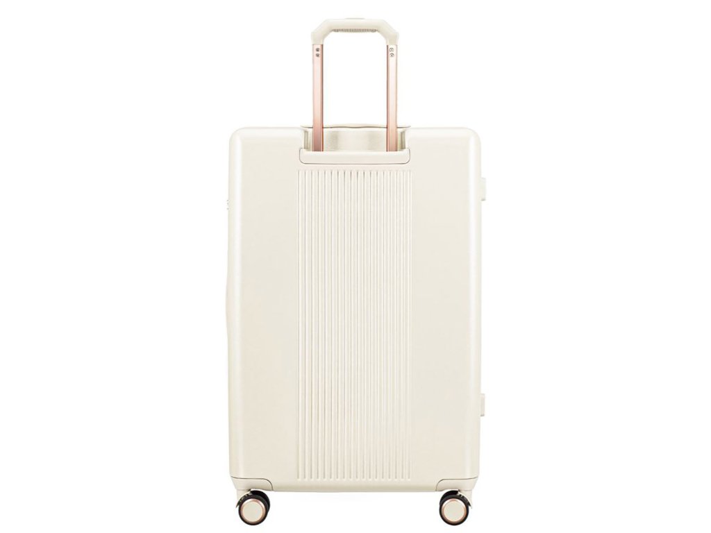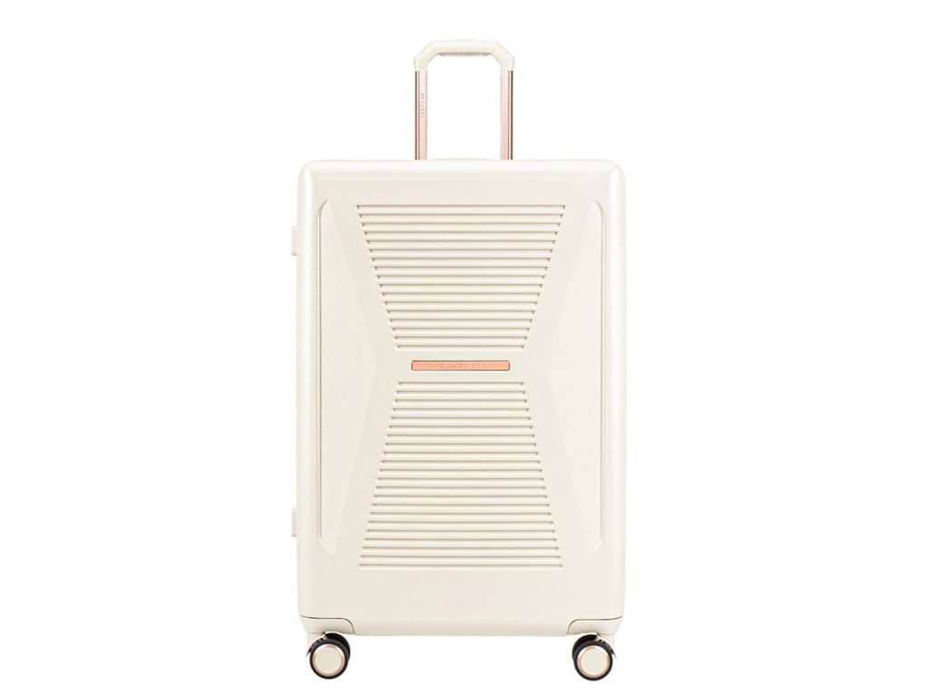 Kvalitní bíly velký cestovní kufr, který má zajímavý design hlavně díky žebrování do tvaru přesýpacích hodin. Je vyroben z nejkvalitnějšího polykarbonátu, který vám zaručí, že je více chráněn proti promáčknutí a poškrábání. Kufr se pohybuje pomocí 4 koleček, která se otáčejí o 360 stupňů. Všechny kované prvky jsou v barvě růžového zlata.